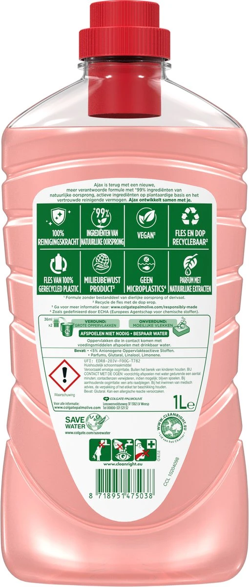 Laat je huis stralen en heerlijk ruiken met Ajax Fête des Fleurs Hibiscus allesreiniger. Deze Ajax allesreiniger heeft een nieuwe meer verantwoorde formule gemaakt van 99% ingrediënen van natuurlijke oorsprong en een sterkere langdurige geur. Ajax Fête des Fleurs Hibiscus zit daarnaast in een fles is gemaakt van 100% gerecycled plastic en 100% recyclebaar. Deze allesreiniger is vegan. Ajax schoonmaakmiddel respecteert ook kwetsbare oppervlakken zoals marmer en keramiek, waardoor alles weer heerlijk fris ruikt. Wanneer je zorgt voor je huis, kun je er gerust op zijn dat Ajax zorgt voor de planeet. Ajax ontwikkelt samen met jou!