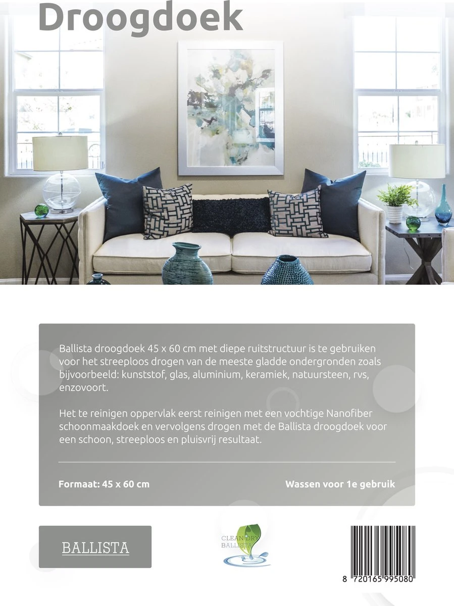 De Ballista droogdoek 45 x 60 cm met een diepe ruitstructuur zijn te gebruiken voor het drogen van diverse ondergronden zoals bijvoorbeeld: kunststof, glas, aluminium, keramiek, natuursteen, rvs, enzovoort. Het te reinigen oppervlak eerst reinigen met de vochtige Nanofiber schoonmaakdoek en vervolgens drogen met de Ballista droogdoek voor een schoon, streeploos en pluisvrij resultaat.