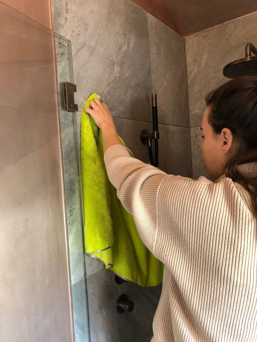 Om jouw glazen douchedeur of tegels droog te maken beweeg of sleept je de doek over het oppervlak. Je zult direct zien dat het vocht is verdwenen. Eventueel kan je dit nog nalopen met een kleinere microvezeldoek om streepvorming te voorkomen. De droogdoek kan gewoon gewassen worden op 60° en gaat ongeveer 200 wasbeurten mee. Stop hem nooit in een wasdroger en voorkom het gebruik van waspoeder. Dit zal de levensduur en werking van de doek sterk verkleinen.