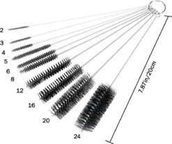 Deze borstelset bestaat uit 10 borsteltjes (lengte 20cm) in verschillende borstelmaten en is gemaakt van roestvrij staal met nylon wol.